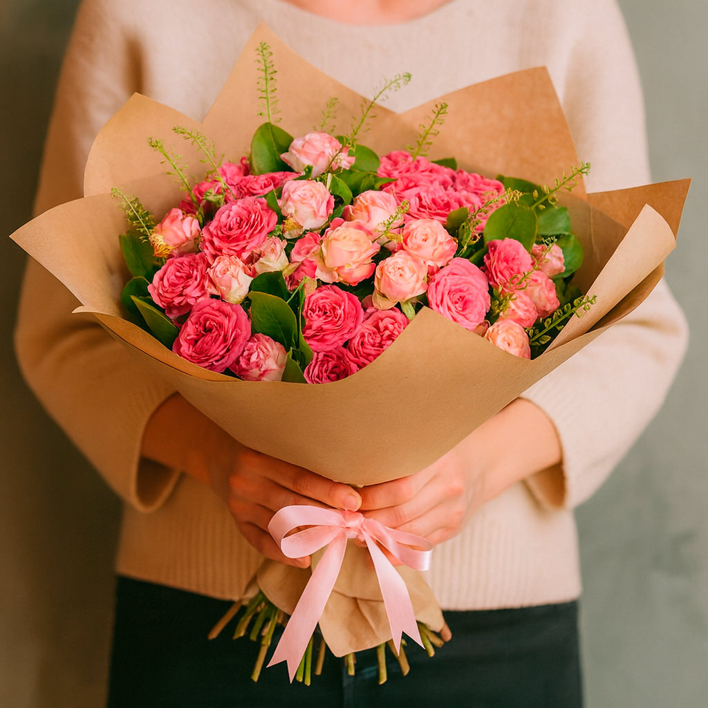 Розовые кустовые розы в сочетании с нежной зеленью создают восхитительную композицию. Букет оформлен в крафт-бумагу и перевязан атласной лентой. Альтернативные варианты упаковки: матовая плёнка или декоративная сетка. Прекрасный подарок для жены на годовщину или для подруги на день рождения.