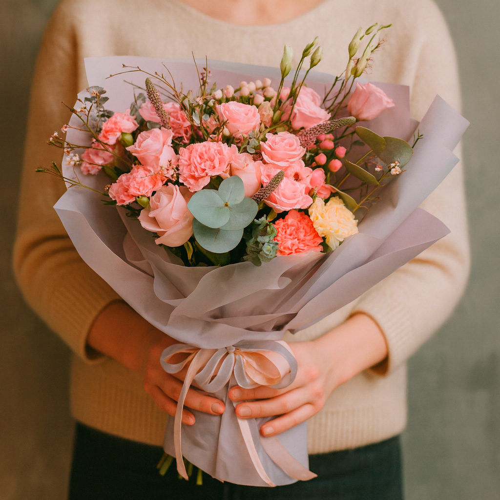 Букет «Розовое сияние» — настоящий оркестр цветов, где каждый компонент идеально сочетается с остальными. Разнообразие и гармония поражают, создавая атмосферу, которая надолго остается в памяти.