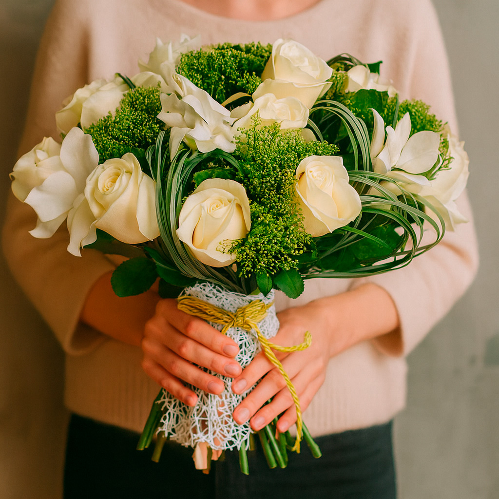 Белые розы и фрезии в сочетании с зеленью берграса и салала создают нежный и утончённый образ. Букет перевязан декоративной сеткой и лентой, подчёркивающей его элегантность. Возможны варианты упаковки с матовой плёнкой или крафт-бумагой. Прекрасный выбор для подарка на свадьбу или для любимой.