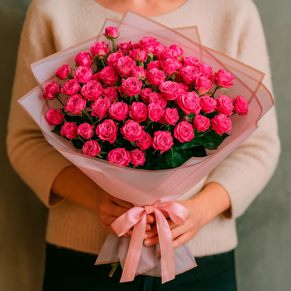 Кустовые розы «Бомбастик» создают нежную и романтичную композицию, наполненную свежестью и изяществом. Упакован в матовую плёнку нежно-розового цвета и перевязан атласной лентой. Возможны варианты упаковки: крафт-бумага или декоративная сетка. Прекрасный выбор для любимой на день рождения или годовщину.