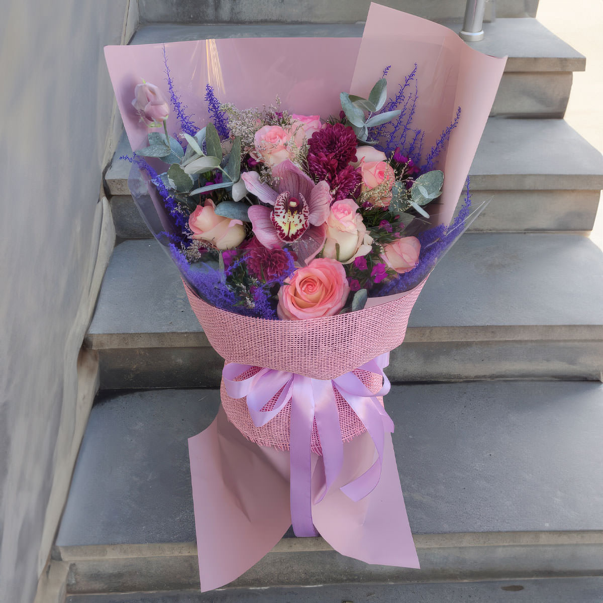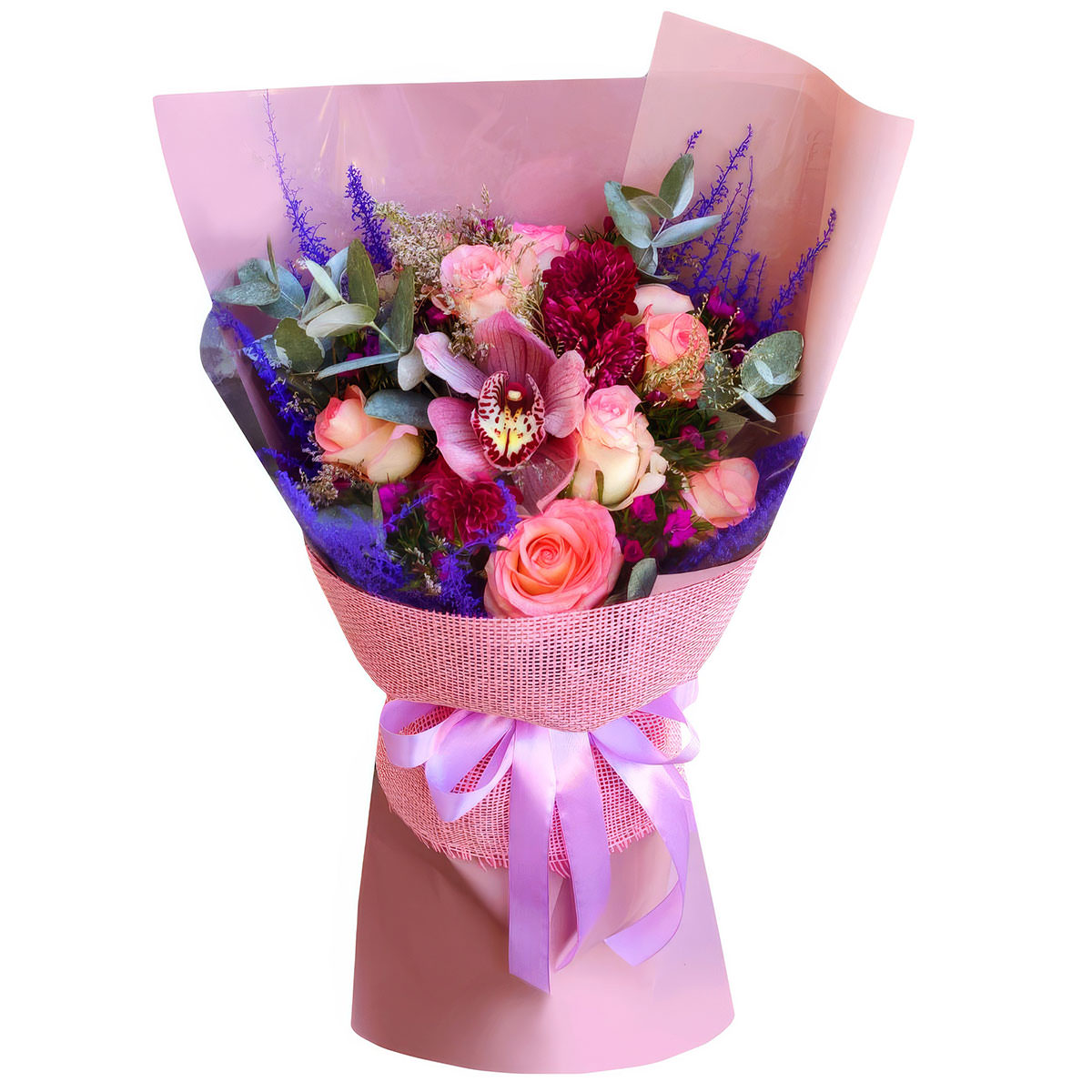 Роскошное сочетание розовых орхидей, роз и бордовых георгин создаёт неповторимую композицию. Вероника и эвкалипт добавляют свежести и изысканности. Букет оформлен в матовой плёнке и перевязан атласной лентой. Возможны альтернативы упаковки: крафт-бумага или декоративная сетка. Прекрасный выбор для годовщины или для любимой.