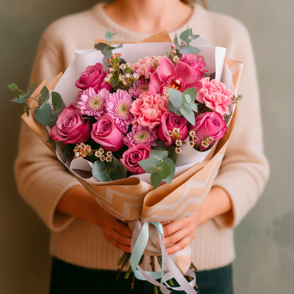 Розовые розы и орхидеи создают яркий акцент в этом букете, дополненные сиреневыми хризантемами и нежным ваксфлауэром. Эвкалипт придаёт композиции свежесть и легкость. Упакован в крафт-бумагу с матовой плёнкой и перевязан атласной лентой. Альтернативно можно оформить в декоративную сетку или фетр. Прекрасный выбор для подарка на день рождения для любимой.