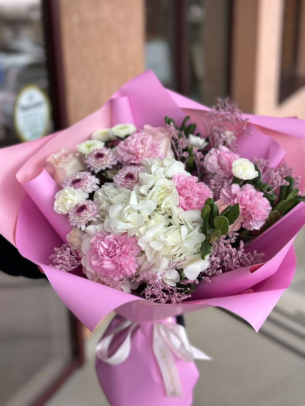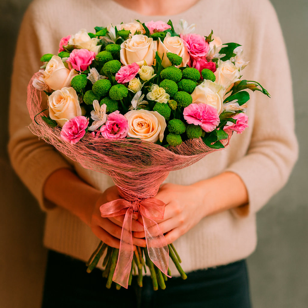 Роскошное сочетание кремовых роз, кустовых хризантем и нежных альстромерий создаёт атмосферу утончённой элегантности. Розовые эустомы добавляют яркий акцент, подчёркивая изящество композиции. Букет перевязан розовой сеткой, что придаёт ему лёгкость и воздушность. Альтернативно можно использовать атласную ленту или матовую плёнку. Прекрасный выбор для подарка на день рождения для любимой или мамы.
