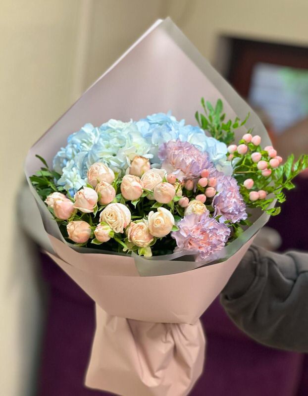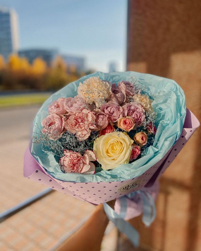 Флористический букет «Цветочная фантазия» — восхитительная композиция цветов, в которой каждый компонент органично взаимодействует с остальными. Все детали продуманы до мелочей, а цветовая палитра создает своеобразную атмосферу.