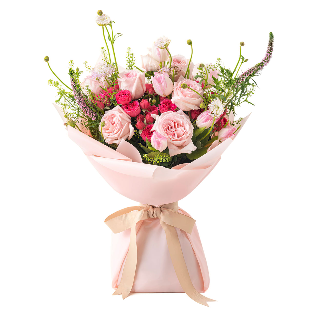 Нежные пионовидные розы, розовые кустовые розы и тюльпаны создают романтичную атмосферу, дополненную шалфеем, вероникой и пеннисетумом. Букет оформлен в матовую плёнку и перевязан атласной лентой. Возможны альтернативы упаковки: крафт-бумага или декоративная сетка. Прекрасный выбор для подарка на день рождения для любимой.