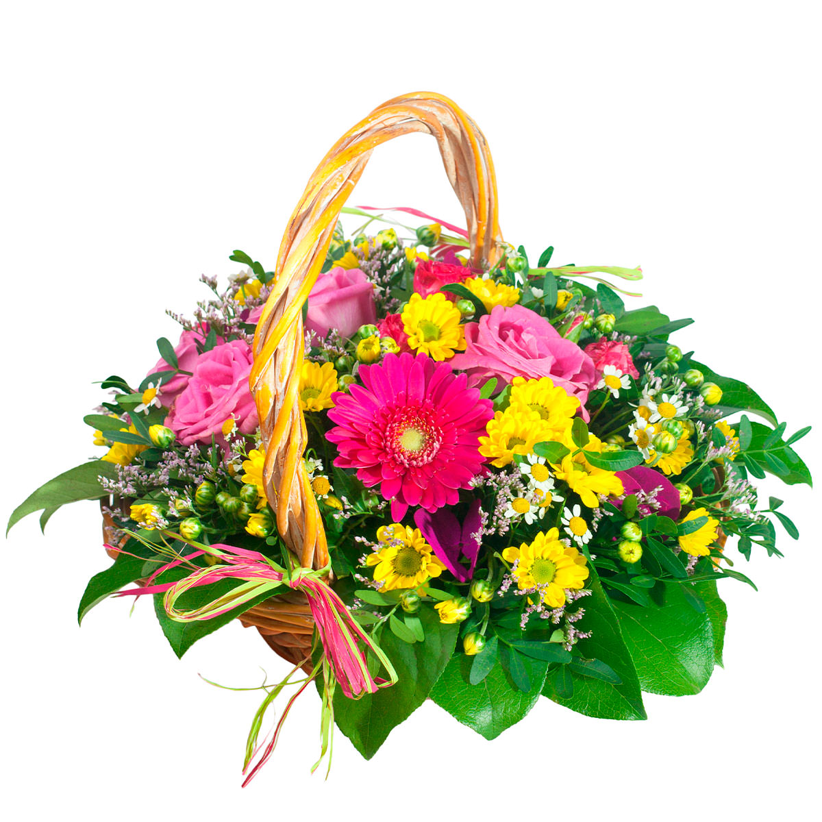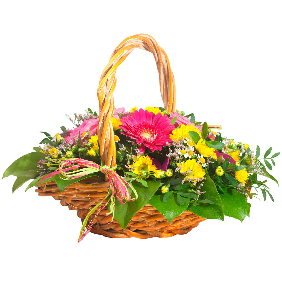 Яркая композиция из розовой герберы, жёлтой кустовой хризантемы, нежной ромашки и лимониума создаёт атмосферу праздника. Плетёная корзина добавляет естественности и уюта. Альтернативные варианты оформления: корзина из лозы или с тканевой отделкой. Прекрасный подарок для любимой на день рождения или годовщину.