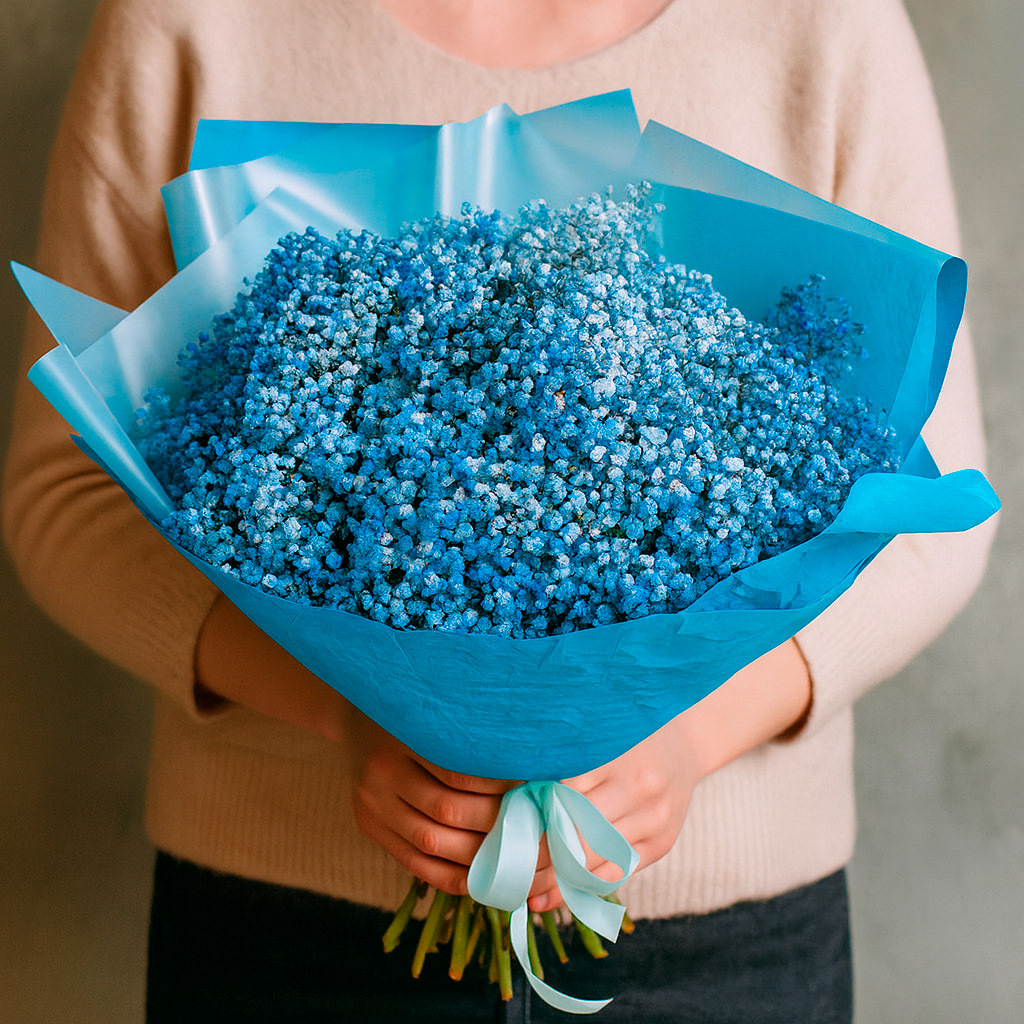 Сине-голубая гипсофила создает воздушное облако нежности и свежести. Букет оформлен в матовую пленку с голубой атласной лентой, подчеркивающей его изысканность. Возможна упаковка в крафт-бумагу или декоративную сетку. Идеальный подарок для любимой на 8 марта или день рождения.