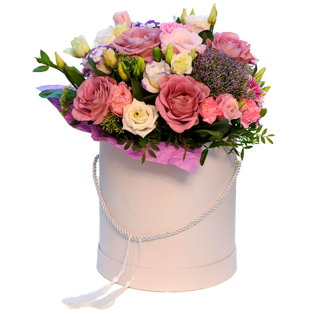 Розовые одноголовые розы и кустовые белые розы создают нежную основу этой композиции, дополненную бело-фиолетовой эустомой и миниатюрными розовыми гвоздиками. Зелень добавляет свежести и объема. Композиция оформлена в элегантной шляпной коробке светлого оттенка. Возможны варианты оформления в бархатной или дизайнерской коробке. Прекрасный подарок для любимой на годовщину или день рождения.