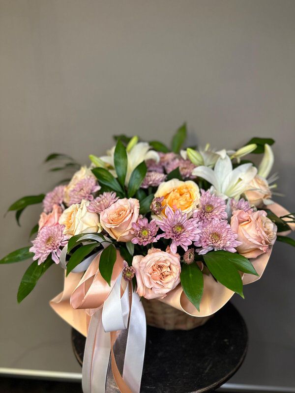 Цветы в коробке «Весеннее очарование» — шедевр флористического творчества, который очаровывает и притягивает внимание всех вокруг. Все детали продуманы до мелочей, а цветовая палитра создает своеобразную атмосферу.