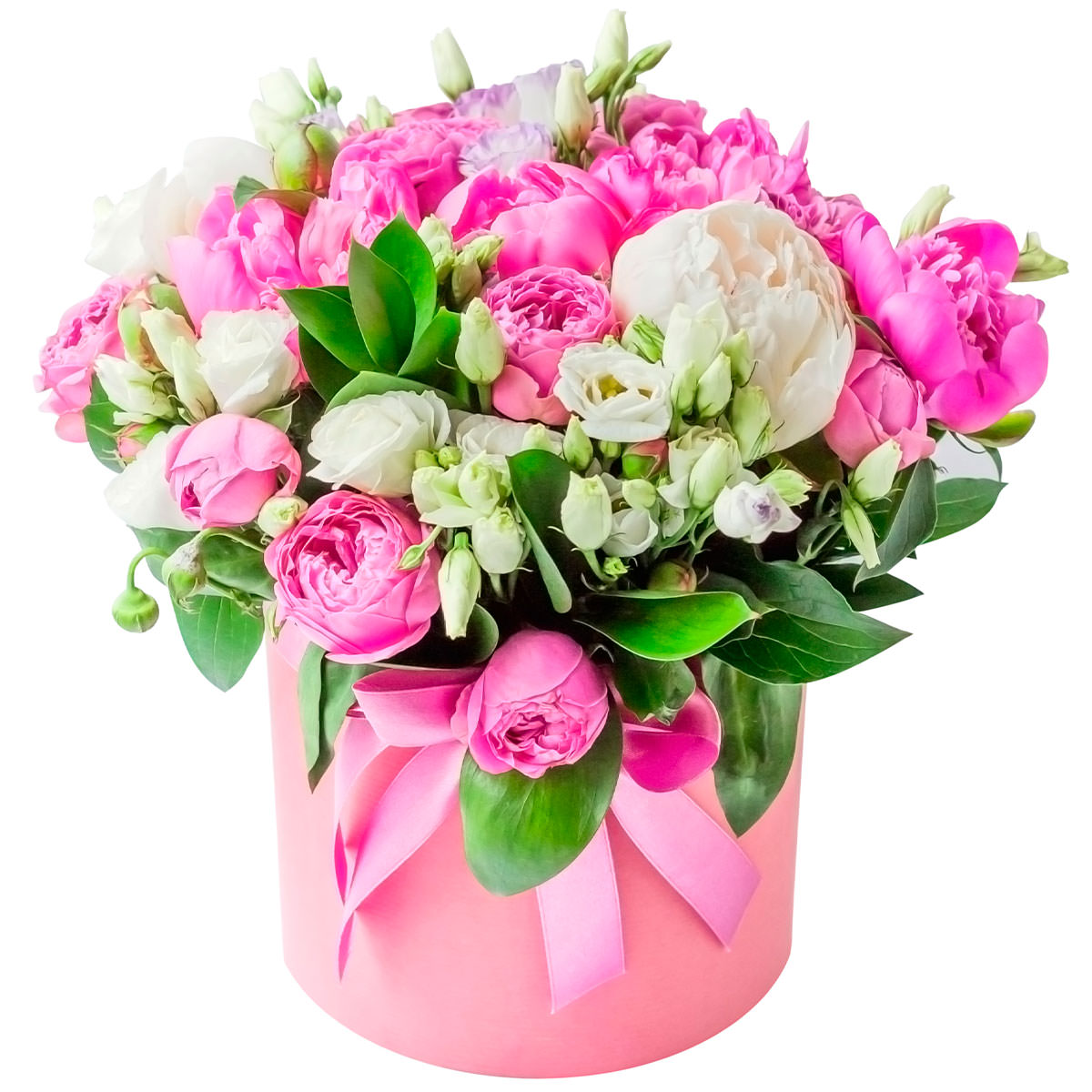 Белые и розовые пионы, розовые кустовые пионовидные розы и белая эустома создают нежное сочетание, подчеркивающее утонченность композиции. Цветы оформлены в элегантной шляпной коробке розового цвета, что добавляет изысканности. Возможны варианты оформления в бархатной или атласной коробке. Прекрасный подарок для любимой на день рождения или годовщину.