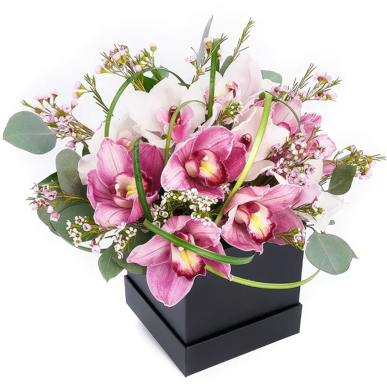 Орхидеи микс в розовых и белых тонах создают изысканную композицию, дополненную свежестью эвкалипта и нежностью оазиса. Черная квадратная шляпная коробка подчеркивает элегантность и стиль. Возможны альтернативы: бархатная коробка или коробка с принтом. Прекрасный подарок для любимой на годовщину или день рождения.